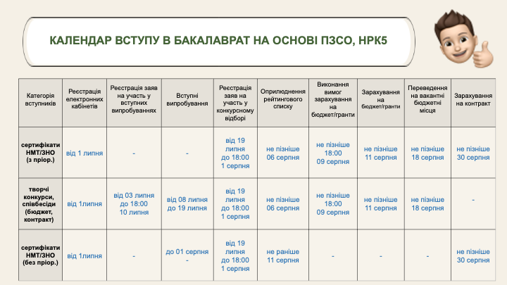 Основні терміни вступної кампанії
