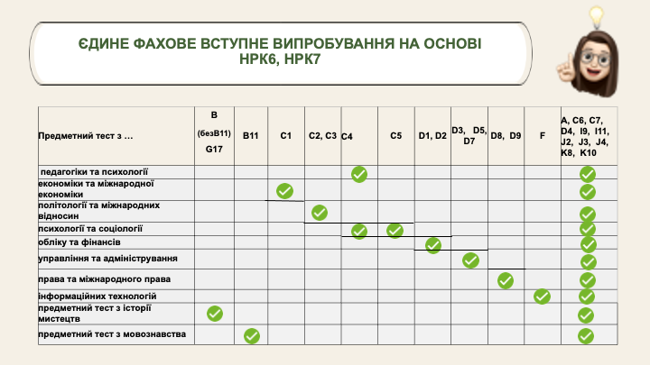 У 2025 році правом вибрати один із предметних тестів можуть скористатися особи, які вибрали для вступу такі спеціальності: