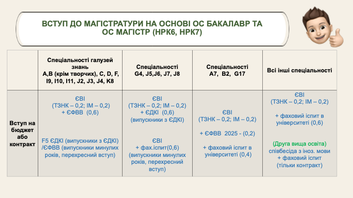 • ЄВІ 2023, або 2024, або 2025 років та ЄФВВ 2025 року (крім вступників на спеціальність F5 «Кібербезпека та захист інформації», які складали відповідний ЄДКІ 2024 або 2025 року);